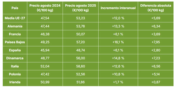 En la UE de los 27, el precio medio de agosto subió 0,5 euros en relación al mes de julio, mientras que en el balance interanual se aprecia un significativo incremento del 12% al pasar de los 47,54 euros por kilo de agosto de 2024 a los 53,23 actuales.