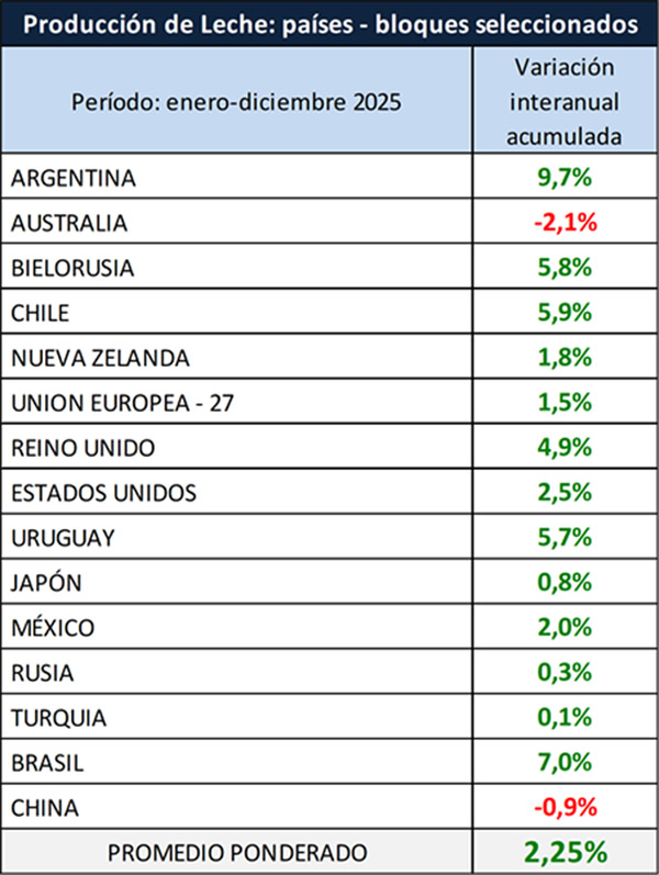 El Observatorio de la Cadena Láctea Argentina (OCLA) publicó datos que consideran a un grupo seleccionado de los principales países que representan algo más del 55% de la producción mundial de leche de vaca, en el cual se puede observar un alza de la producción del 2,2%, para el año 2025 respecto al año 2024.