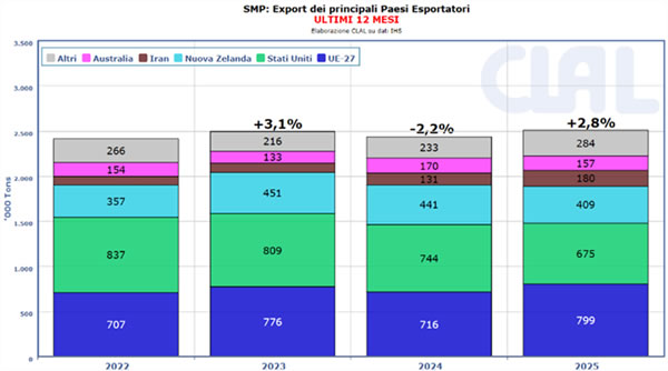 En los últimos años, el país se ha consolidado como uno de los principales exportadores mundiales de leche en polvo descremada - LPD, alcanzando el cuarto puesto a nivel mundial en 2025, por detrás de la Unión Europea, Nueva Zelanda y Estados Unidos, y superando a Australia.