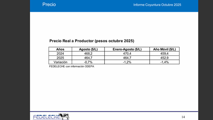 El precio real por litro pagado al productor en agosto de 2025 cayó un 0,7% en comparación con igual periodo del año anterior, equivalente a $3,41 por litro, pasando de $ 468,16 a $ 464,75 por litro.