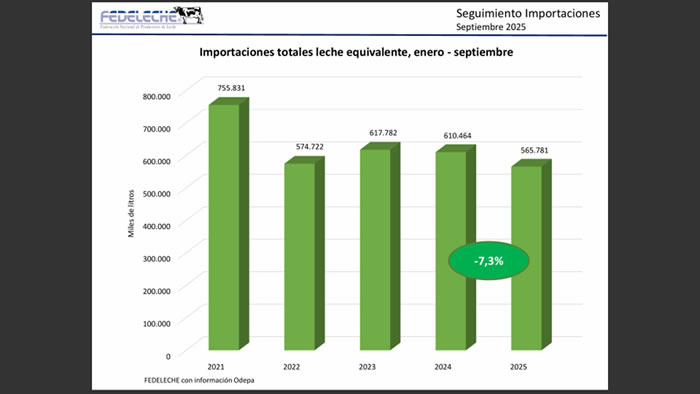 Nacional, 17 de noviembre de 2025.- De acuerdo al último informe de Seguimiento de Importaciones elaborado por Fedeleche, de enero a septiembre de 2025, las importaciones de leche equivalente sumaron los 565,78 millones de litros, lo cual representa una caída del 7,3% % respecto al mismo período del año anterior. Este es el volumen más bajo registrado en los últimos cinco años.