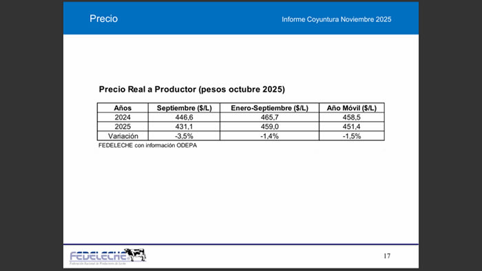 El precio real por litro pagado al productor en septiembre de 2025 cayó un 3,5% en comparación con igual periodo del año anterior, equivalente a $15,47 por litro, pasando de $446,57 a $431,10 por litro.