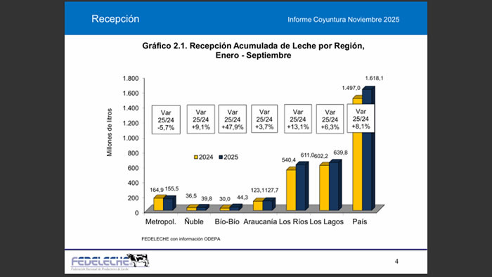 En la región de Los Ríos, se observa un alza de 13,1% respecto del mismo periodo de 2024, con un incremento de 70,6 a 611,0 millones de litros, lo que se traduce en una participación del 37,8% en la recepción nacional y un crecimiento anual de 70,6 millones, el volumen más incidente del año.