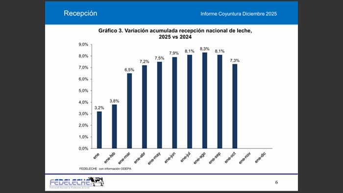 Asimismo, la recepción de leche cruda de Nestlé mostró un alza de 5,0% hasta alcanzar 31,0 millones de litros, lo que implica un aumento de 1,4 millones de litros en comparación con el año anterior.