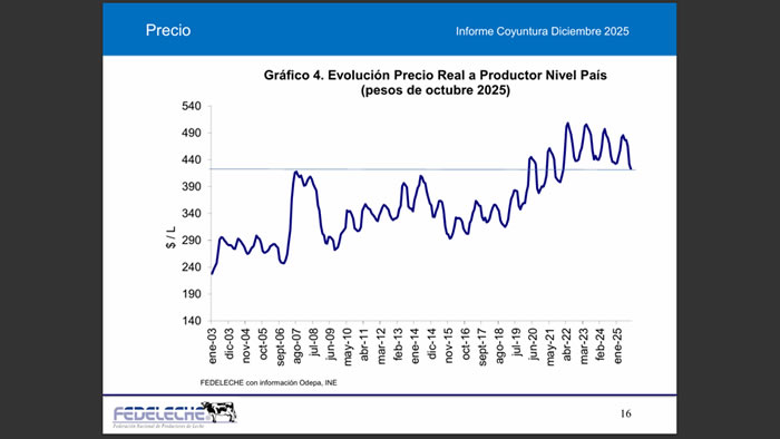 El precio real por litro pagado al productor en octubre de 2025 cae un 2,9% en comparación con igual periodo del año anterior, equivalente a $ 12,74 por litro, pasando de $ 435,40 a $ 422,66 por litro.