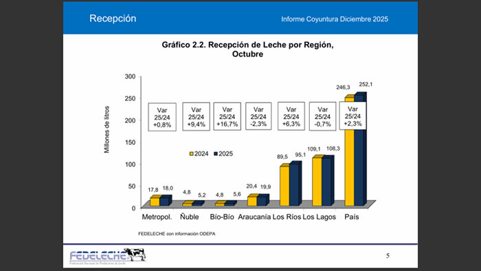 En base a los antecedentes publicados por la Oficina de Estudios y Políticas Agrarias (Odepa), el gremio informa que la recepción de leche cruda en la región de Los Lagos presenta un crecimiento acumulado de 5,2% al mes de octubre respecto al mismo periodo de 2024, subiendo de 711,2 a 748,1 millones de litros, lo que concentra el 40,0% dentro del total a nivel nacional, con una variación interanual de 36,8 millones de litros.