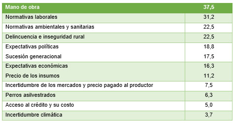 El informe de Fedeleche identificó a su vez múltiples dificultades que condicionan la competitividad que enfrenta el sector: la escasez y calificación de mano de obra es considerada como la principal con el 37,5%, seguida por las exigencias normativas laborales (31,2%), normativas ambientales y sanitarias (22,5%); Delincuencia e inseguridad rural (22,5%); Expectativas políticas (18,8%); sucesión generacional (17,5%) y las expectativas económicas (16,3%) e insumos (11,2%). Otros factores mencionados incluyen Incertidumbre de los mercados y precio pagado al productor (7,5%); daños al ganado por perros asilvestrados (6,3%), acceso al crédito y su costo (5,0%), y la variabilidad climática (3,7%)