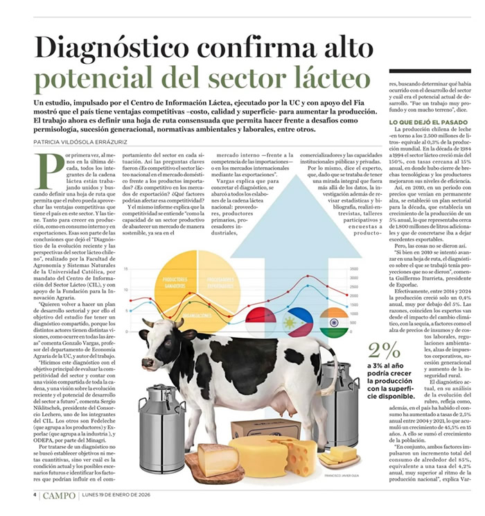 Esas son parte de las conclusiones que dejó el 'Diagnóstico de la evolución reciente y las perspectivas del sector lácteo chileno', realizado por la Facultad de Agronomía y Sistemas Naturales de la Universidad Católica, por mandato del Centro de Información del Sector Lácteo (CIL), y con apoyo de la Fundación para la Innovación Agraria.