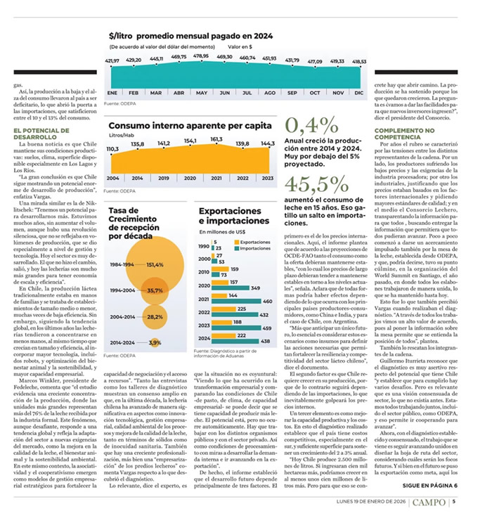 'Hicimos este diagnóstico con el objetivo principal de evaluar la competitividad del sector y contar con una visión compartida de toda la cadena, y una visión sobre la evolución reciente y el potencial de desarrollo del sector a futuro', comenta Sergio Niklitschek, presidente del Consorcio Lechero, uno de los integrantes del CIL. Los otros son Fedeleche (que agrupa a los productores) y Exporlac (que agrupa a la industria), y ODEPA, por parte del Minagri.