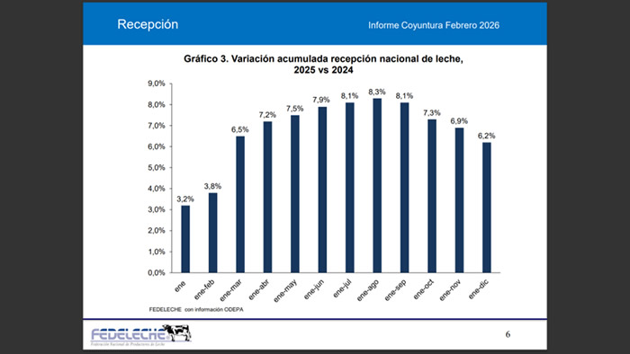 La recepción nacional de leche cruda registró en 2025 un crecimiento del 6,2% respecto del año anterior, alcanzando un total de 2.371,1 millones de litros, según informa Fedeleche en base a datos oficiales de Odepa.