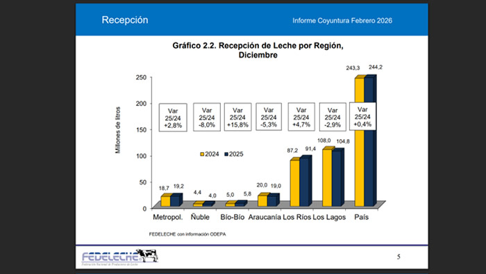 - Recepción lechera en Chile suma 2.371,1 millones de litros en 2025.