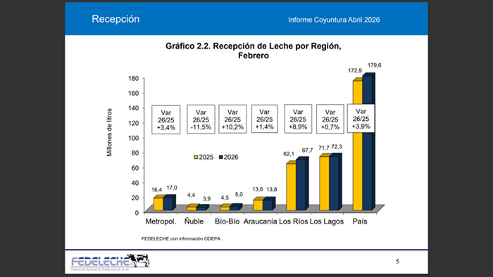 En la región de Los Lagos, la recepción de leche cruda se elevó un 0,7%, con un total de 72,3 millones de litros. Lo anterior, representa un aumento de 0,6 mil litros frente al mismo mes de 2025.