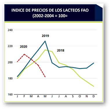 Se pronostica que las exportaciones mundiales de productos lácteos en 2020 se contraerán en un 4% a 74 millones de toneladas (en equivalente de leche), lo que, de confirmarse, marcaría la mayor disminución interanual en tres décadas. E