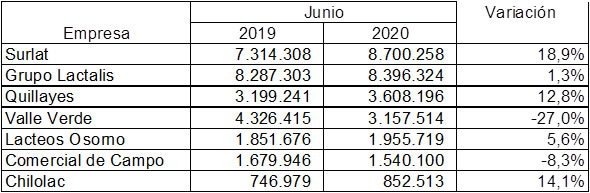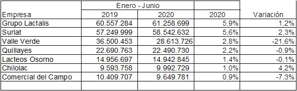 Entre enero y junio de 2020, la recepción nacional de leche sigue siendo liderada por la cooperativa lechera Colun con un volumen que creció un 6,0% respecto del año anterior hasta 291,5 millones de litros. Lo anterior, supone una participación de Colun sobre el total del 27,9% y un crecimiento en litros, de 16,5 millones de litros en relación con el ejercicio pasado.