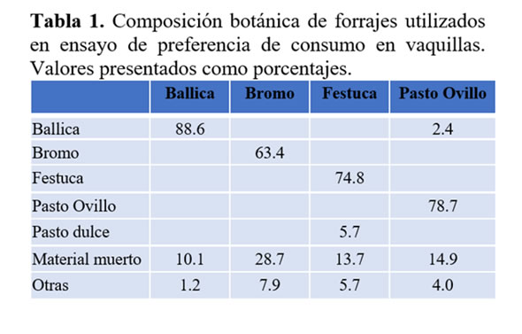 Los forrajes evaluados fueron ballica (Lolium perenne), bromo (Bromus valdiveanus), pasto ovillo (Dactylis glomerata) y festuca (Festuca arundicacea). Se realizaron 5 ensayos para evaluar distintos escenarios de oferta de forraje: ballica vs bromo; ballica vs pasto ovillo, bromo vs pasto ovillo; ballica vs bromo vs festuca; y finalmente, ballica vs bromo vs festuca vs pasto ovillo.