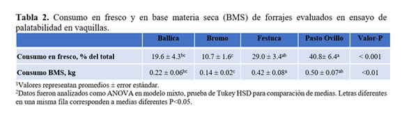 Considerando el consumo total de los cuatro forrajes ofrecidos, las vaquillas en promedio consumieron 4,6 kilos de forraje verde y 1,3 de forraje en base materia seca, durante las 3 horas de evaluación. En la Tabla 2 se muestran los promedios de consumo de cada forraje, durante las tres horas de evaluación diaria, en base materia seca (kg) y consumo de forraje fresco.