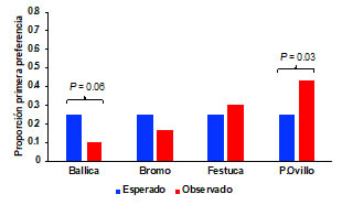 Otra variable analizada fue la frecuencia con que los animales prefirieron consumir un forraje en su primera elección. En este análisis se determinó que hubo una mayor frecuencia de primera preferencia para el pasto ovillo, y una menor frecuencia de preferencia por la ballica (Figura 2).