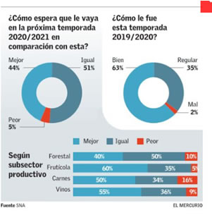 El presidente de la SNA, Ricardo Ariztía, calificó como 'sorprendentes' los resultados. 'En general, en las encuestas somos muy negativos y hoy día eso se ha revertido en una forma bastante importante, me parece muy bien las expectativas y la motivación de los agricultores a seguir trabajando ya seguir generando empleos e inversiones', dijo.