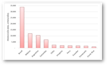 Hay tres países (Brasil, Uruguay y México), con la línea resaltada con un marcador circular, en los que la producción aumentó entre un 10 y 20%, pero con diferencias marcadas entre México (12.006 millones), que tiene tasas de crecimiento pequeñas pero sostenidas, del caso de Brasil (33.840 millones) y Uruguay (2.173 millones), que desde el año 2014 tienen su producción prácticamente estancada, reforzando el comportamiento ya indicado para el conjunto de la región.