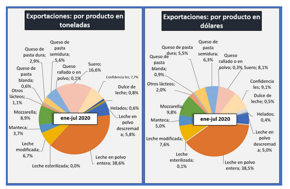 El principal producto exportado tanto en volumen como en valor sigue siendo la leche en polvo entera (fundamentalmente en bolsas de 25 kgs.) y los quesos en general representan el 18,1% y el 22,8%, respectivamente.