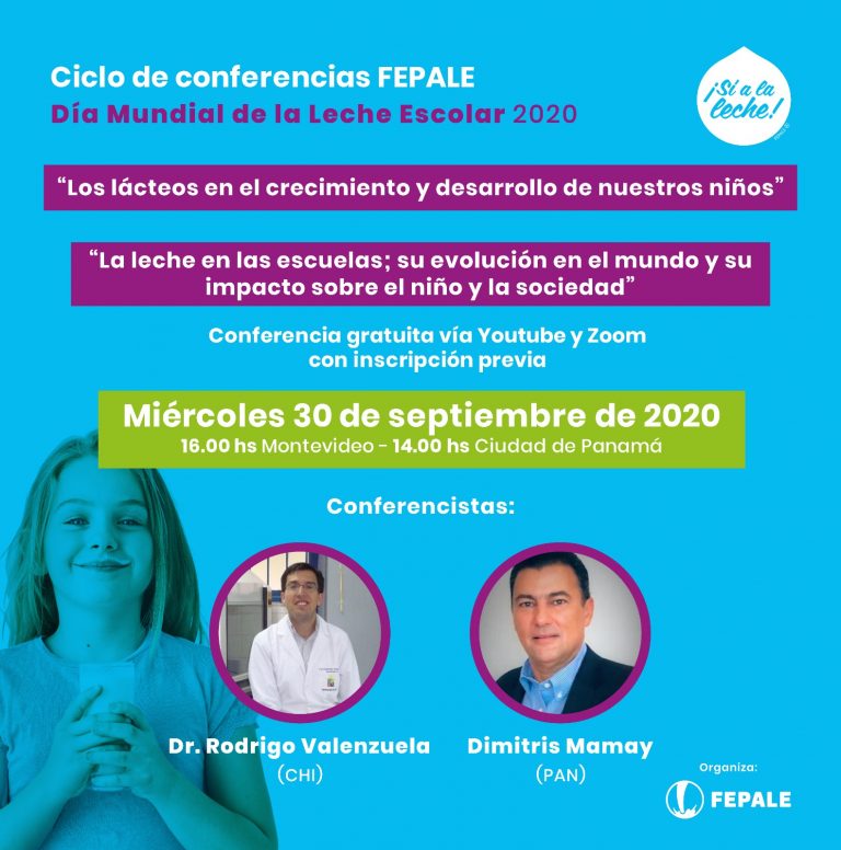 Como parte del Ciclo de Conferencias FEPALE en el Mes de la Leche y del Día Mundial de la Leche Escolar, el próximo miércoles 30 de septiembre a las 16:00 horas de Chile y Montevideo, se realizará un webinario con la exposiciones tituladas: “Los lácteos en el crecimiento y desarrollo de nuestros niños” y “La leche en las escuelas; su evolución en el mundo y su impacto sobre el niño y la sociedad”