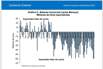 Cabe consignar que en términos físicos las exportaciones lácteas a julio sumaron 195,6 millones de litros equivalentes, mientras las importaciones acumularon 481,0 millones de litros equivalentes, condición que confirma a Chile como un país importador neto de productos lácteos.