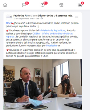 Webinario de actualidad láctea internacional y de prospección de nuevos mercados para la exportación de productos lácteos nacionales, revisión de las modificaciones al reglamento de la nueva Ley de Etiquetado de la Leche y la generación de nuevos estudios para promover una marca país para la leche chilena, destacaron entre las acciones que viene desarrollando la Comisión Nacional de la Leche, encabezada actualmente por el Ministro de Agricultura, Antonio Walker, coordinada por Odepa y conformada por entidades del sector público como privado.