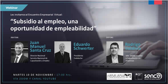 En el webinar “Encuentro empresarial Sence – Fedeleche: Beneficios del subsidio al empleo, una oportunidad de empleabilidad", participarán el director nacional (s) del Servicio Nacional de Capacitación y Empleo, Ricardo Ruiz De Viñaspre; el presidente de Federación Nacional de Productores de Leche, Eduardo Schwerter, y Rodrigo Valdivia, Jefe del Departamento y Capacitación en Empresa de Sence.
