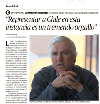 La elección del nuevo directorio de la Federación Panamericana de Lechería (Fepale) realizada en forma virtual el pasado viernes 28 de noviembre, con motivo de su 28° Asamblea General Anual, marcó un hito para esa actividad nacional. Por primera vez, un dirigente del país y de la región, asumió la presidencia de esa organización internacional, en la que participan 55 socios de toda la cadena láctea, así como de instituciones y empresas públicas y privadas de sus 19 países miembros.