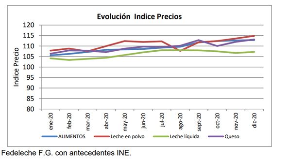 Para el mes de diciembre 2020 se observa que entre los productos con mayor incidencia al alza aparece el queso, registrando una variación que fue de un 1,1%. Por otra parte, dentro de los productos con una mayor incidencia a la baja, dentro de los alimentos, no aparece ningún producto lácteo.