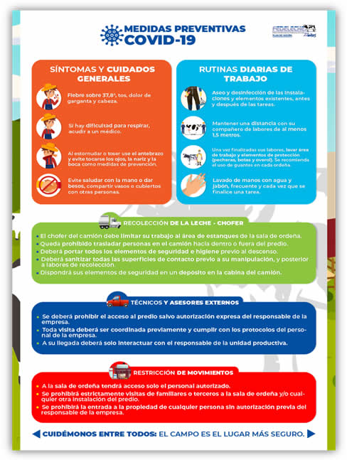 “Estos protocolos contemplan las responsabilidades y acciones a implementar en las lecherías. Las condiciones exigidas por la autoridad, y agrega las medidas que tienen por objetivo disminuir las posibilidades de contagio entre las personas que trabajan en los predios, y de quienes además acuden a retirar la leche, prestan asesoría o algún servicio de mantención”, detalló el presidente de Fedeleche, Eduardo Schwerter.