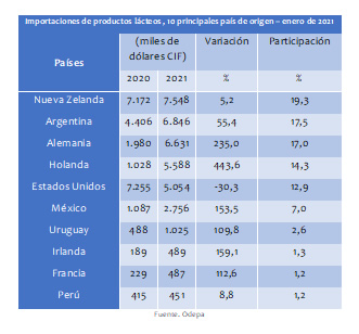 Aun así, el principal país proveedor de productos lácteos sigue siendo Nueva Zelanda, con una participación de mercado que en enero de 2021 alcanza un 19,3%, y envíos por US$ 7,5 millones. En relación con el año anterior, las ventas subieron un 5,2%, equivalente a US$ 376 mil adicionales.