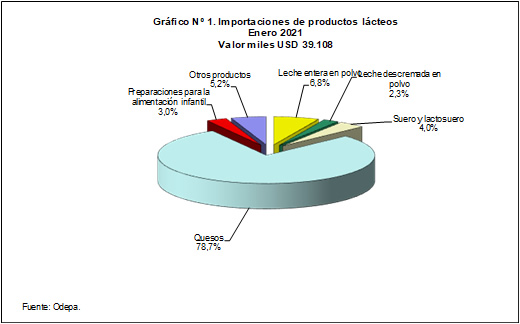 El valor de las importaciones de productos lácteos registró en enero de 2021 un aumento de un 46,9% respecto de igual mes del año anterior hasta US$ 39,1 millones, ratificando una tendencia al alza que se viene observando desde a mediados de 2020.