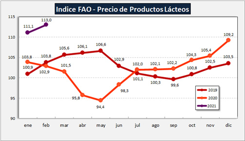 El índice de precios de los productos lácteos de la FAO se situó en un promedio de 113,0 puntos en febrero, con un aumento de 1,9 puntos (un 1,7 %) respecto de enero, subiendo por noveno mes consecutivo y acercándose al nivel más elevado en 40 meses.