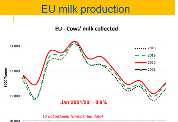De las presentaciones e información intercambiada durante la reunión se destacó lo siguiente: La recolección de leche de la UE disminuyó en enero de 2021 en un 0,9% (-104 000 t) respecto al mismo mes de 2020.