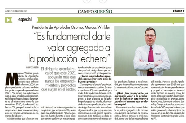 -Para nosotros es fundamental darle un valor agregado a la producción lechera, de manera de posicionarla y darla a conocer a nivel mundial, como una de las mejores leches del mundo. Por eso, desde Aproleche Osorno apoyaremos este 2021 más que nunca a todos los emprendimientos y proyectos que surjan en torno al sector lechero en nuestra zona, tal como a los que ya están desarrollándose vinculados a los gremios, como FuturoCoop, Torrencial Lechero, Surmilk y Campos Australes; sumado a los más de 500 emprendedores que están generando diversos tipos de quesos en el sur de Chile, al alero del Programa Territorial Integrado Lechero PTI.