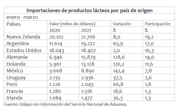 La importación de productos lácteos sigue al alza y alcanzó US$ 113,2 millones entre enero- marzo de 2021, valor lo que representa un incremento de un 44,5% respecto al mismo periodo del año anterior, según datos de Odepa ofrecidos en un nuevo boletín del sector lácteo.
