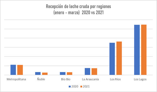 En la región de Los Lagos, donde se recepcionó el equivalente a 47,4% de la leche a nivel nacional, el aprovisionamiento de leche cruda concluyó el primer trimestre de 2021 un 0,2% por encima del mismo lapso del año anterior, alcanzando 273,0 millones de litros, lo que supone un aumento interanual de 571 mil litros.