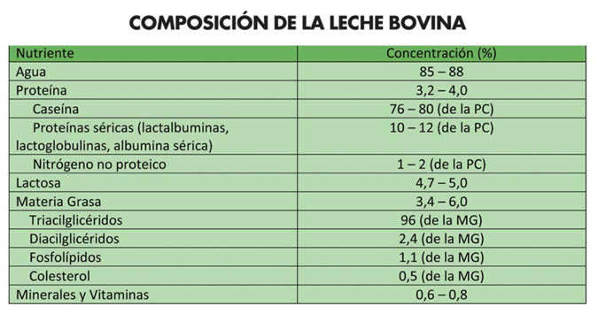 La leche bovina es un alimento compuesto por agua, materia grasa, proteínas lácteas, lactosa, minerales y vitaminas, lo que la convierte en un alimento de muy buenas características nutricionales.