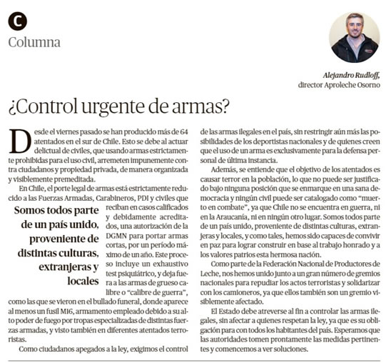 El Estado debe atreverse al fin a controlar las armas ilegales, sin afectar a quienes respetan la ley, ya que es su obligación para con todos los habitantes del país. Esperamos que las autoridades tomen prontamente las medidas pertinentes y comencemos a ver soluciones.
