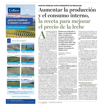 'Tenemos que lograr mejorar el consumo interno de productos lácteos, para lo que tenemos la campaña ‘Yo tomo, yo como' a través del apoyo directo de Promolac. A eso sumaremos un nuevo eslogan que podría llamarse ‘Chile compra local', donde impulsemos a todos los chilenos…' y agrega que en ese camino un avance es el lanzamiento de la marca Chile Milk como paraguas para el posicionamiento de la leche nacional en los mercados internacionales.