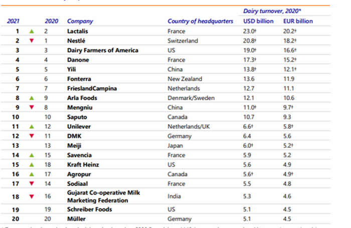 La cooperativa láctea más grande de Estados Unidos, Dairy Farmers of America (DFA), mantiene la tercera posición. La cooperativa superó a Danone del tercer lugar en 2019 después de adquirir Dean Foods. DFA y Danone reportaron ventas más bajas relacionadas con productos lácteos en 2020. DFA se deshizo de algunos activos y volúmenes de leche debido a la adquisición de Dean Foods, mientras que Danone enfrentó algunos vientos en contra en el mercado de fórmulas para bebés.