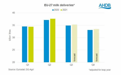 Según la AHDB, para cumplir estas previsiones de la CE, las entregas de leche en el segundo semestre tendrían que crecer un poco más del 1%, siempre y cuando, los precios de la leche cruda sean lo suficientemente altos como para ayudar a compensar el aumento de los costos de los insumos.