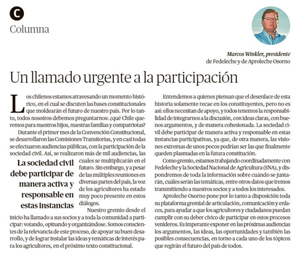 Aproleche Osorno pone por lo tanto a disposición toda su plataforma gremial de articulación, comunicación y enlaces, para ayudar a que los agricultores y ciudadanos puedan cumplir con su deber cívico de participar en estos procesos venideros. Es imperante exponer en las próximas audiencias los argumentos, las ideas, las oportunidades y también las posibles consecuencias, en torno a cada uno de los tópicos que regirán el futuro del país de todos.