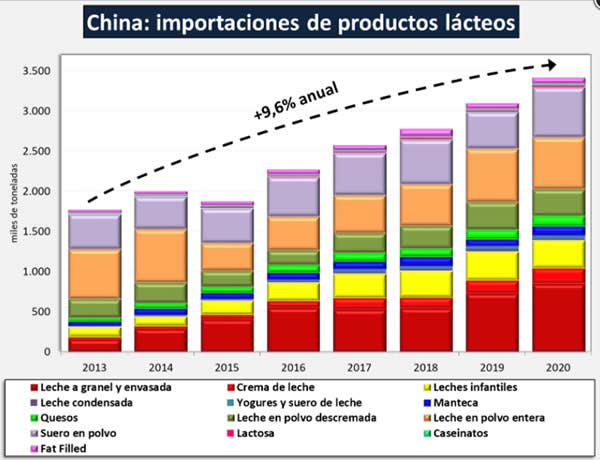 De igual forma, China es por lejos el principal importador de mantequilla, butteroil, leche en polvo entera y descremada, como así también de suero de queso con destino a consumo animal. Aún no tiene una importación tan alta de quesos debido a que sus hábitos de consumo, aunque se están occidentalizando día a día, todavía no se da un gran consumo, pero viene en franco crecimiento.