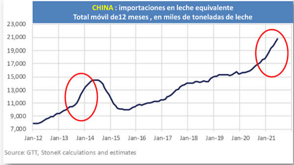 Con los niveles actuales de importaciones, China compra casi el 25% de lo que se comercializa en el mercado mundial de leche, que tiene un volumen de aproximadamente 85 mil millones de litros equivalentes, si no se incluye el comercio entre los países miembros de la Unión Europea. El gráfico de abajo indica el volumen equivalente leche importado por China en 12 meses totales móviles.