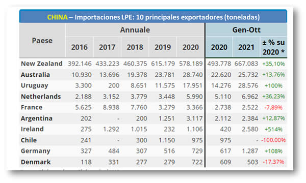 China es el principal importador de Leche en Polvo Entera y su principal proveedor es Nueva Zelanda quien ostenta el 89% de participación de ese producto en el gigante asiático, en el período enero-octubre del 2021.