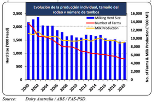 FAS/Canberra pronostica que la producción de leche de Australia aumentará ligeramente a 9,1 MTM en 2022, por encima de la estimación de 2021 de 9,0 MTM. Esto es el resultado de una mayor disponibilidad de forrajes y granos, una mayor disponibilidad de agua de riego a un costo menor junto con los fuertes precios de la leche. La caída en la producción en 2021, junto con la baja tasa de evolución de la producción individual, tamaño del rodeo y número de tambos crecimiento prevista para 2022, es consecuencia de que la producción se ve obstaculizada por la baja disponibilidad de mano de obra y la salida de los productores de leche de la actividad en 2021, clima muy húmedo en los meses de invierno, aumento de los precios de las propiedades de los tambos y precios elevados del ganado de carne.