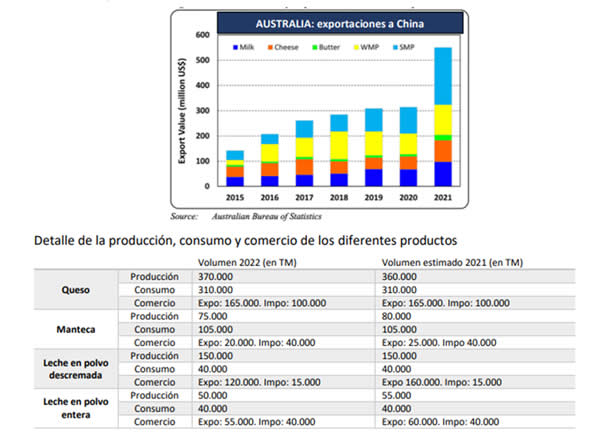 A pesar de producir más queso del que se consume, Australia todavía importa una cantidad significativa, sobre todo de queso blando ya que han estado aumentando la producción de quesos semiduros, predominantemente mozzarella. Se pronostica un aumento marginal del consumo principalmente debido a la expectativa de que Australia se alejará de los cierres relacionados con COVID-19 en 2022 y comenzará a permitir la entrada de viajeros internacionales. Hasta ahora el impacto de los bloqueos ha sido compensado por el consumo de los hogares.