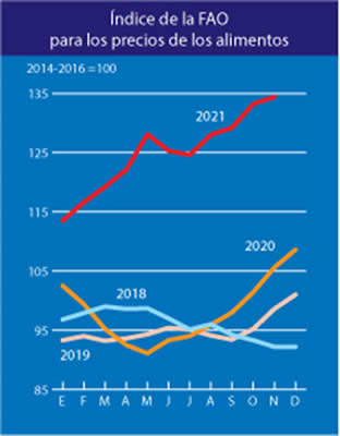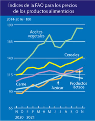 El índice de precios de los alimentos de la FAO se situó en noviembre de 2021 en un promedio de 134,4 puntos, es decir, 1,6 puntos (un 1,2 %) más que en octubre y 28,8 puntos (un 27,3 %) más que en noviembre de 2020. El último aumento representó la cuarta subida mensual consecutiva del valor del índice, que alcanzó su nivel más elevado desde junio de 2011. De todos los subíndices, el de los cereales y el de los productos lácteos fueron los que más subieron en noviembre, seguidos por el del azúcar, mientras que el de la carne y el de los aceites vegetales disminuyeron, aunque ligeramente, respecto del mes anterior.
